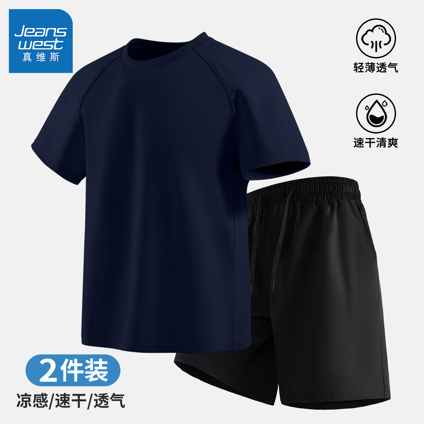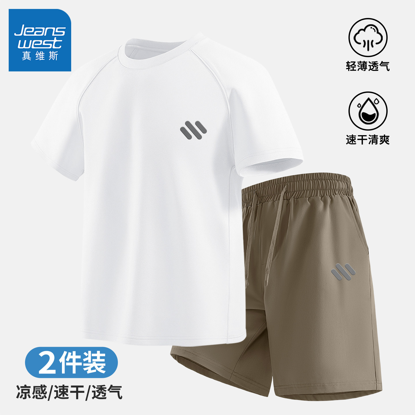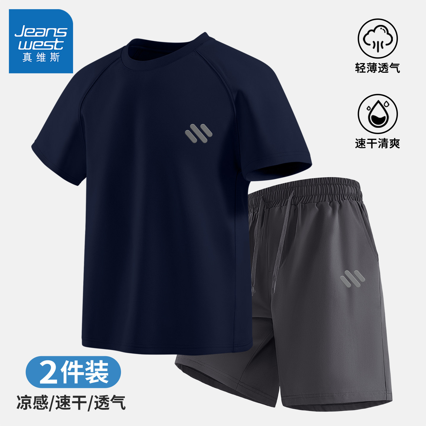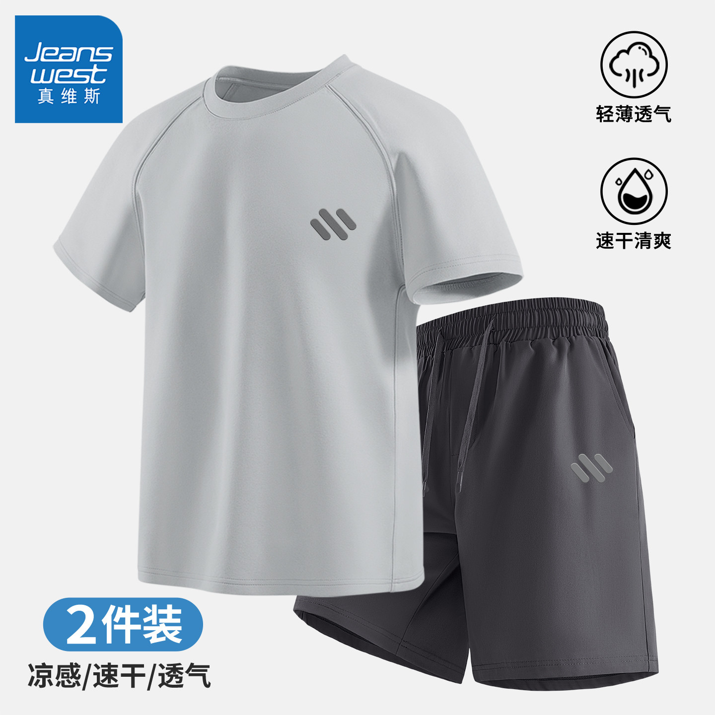 真维斯短袖t恤短裤两件套男夏轻薄透气速干跑步运动休闲套装男士Q