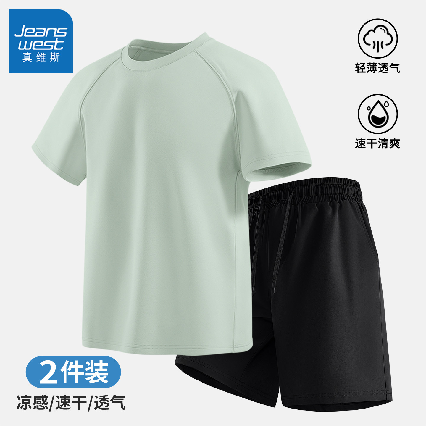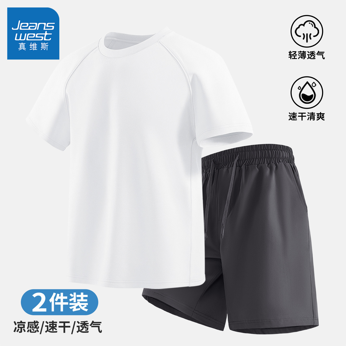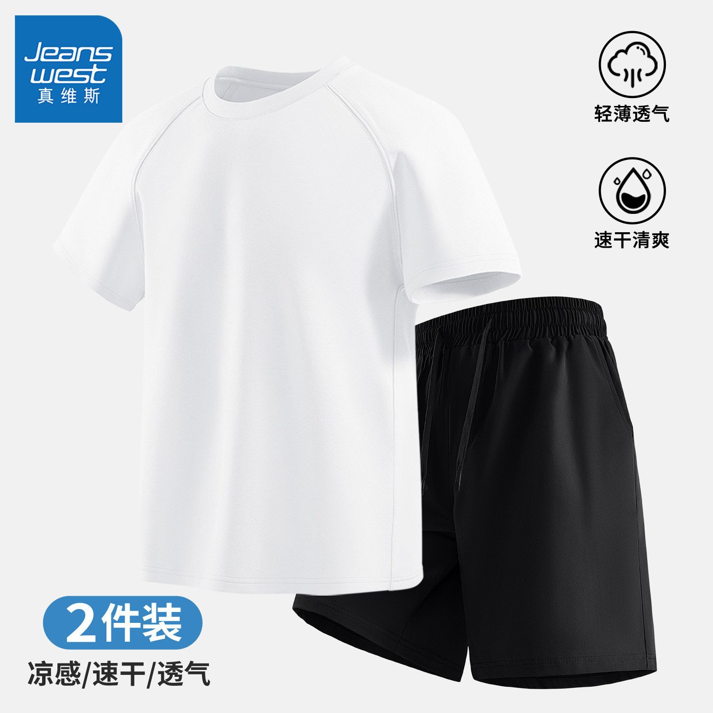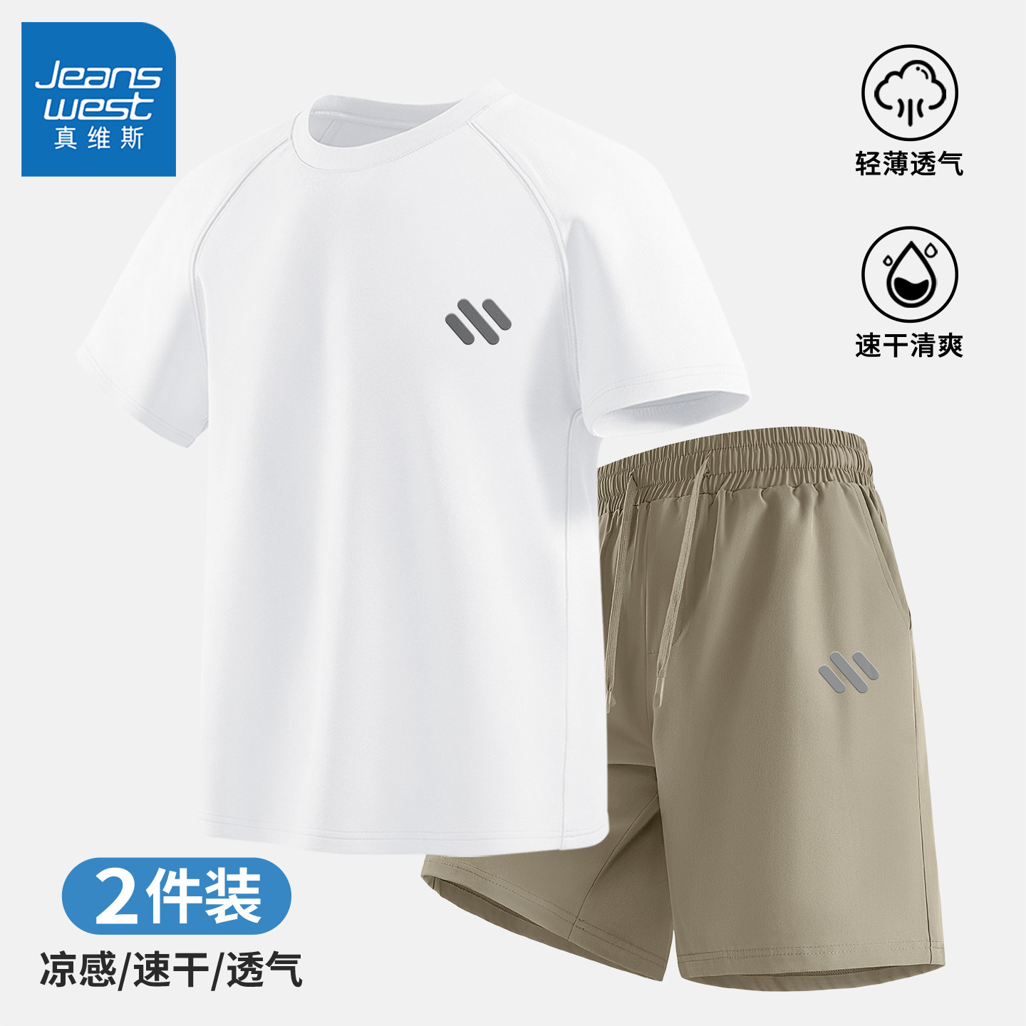 真维斯短袖t恤短裤两件套男夏轻薄透气速干跑步运动休闲套装男士Q