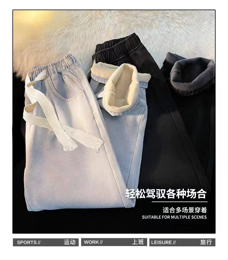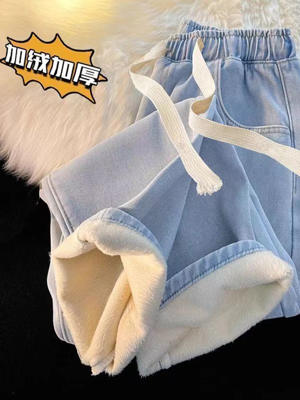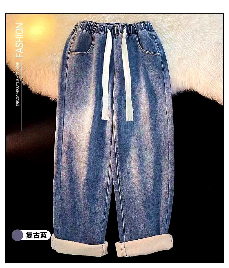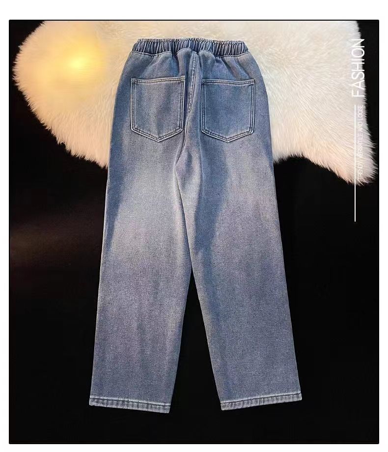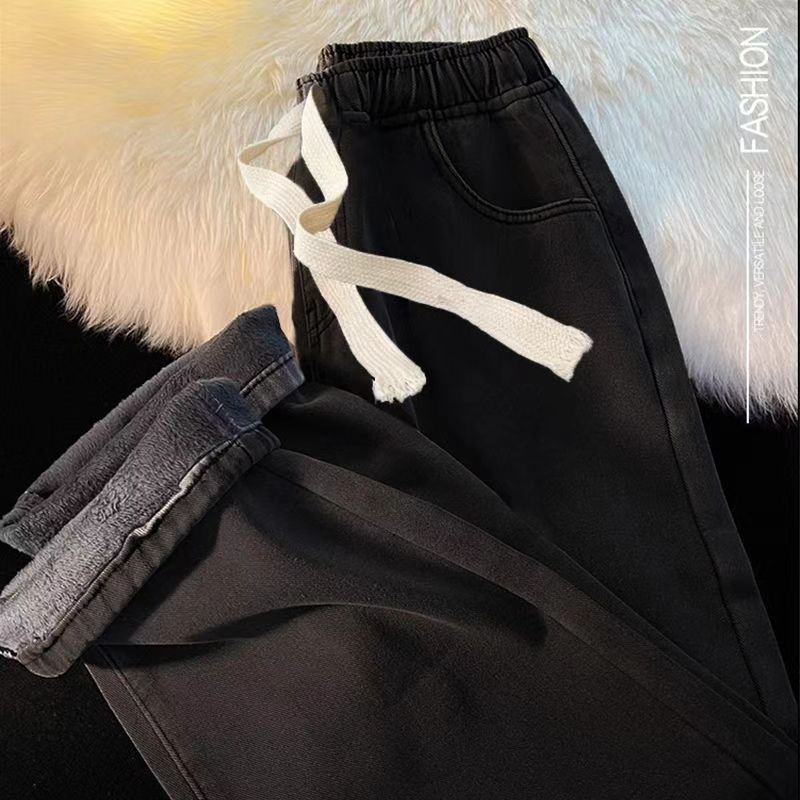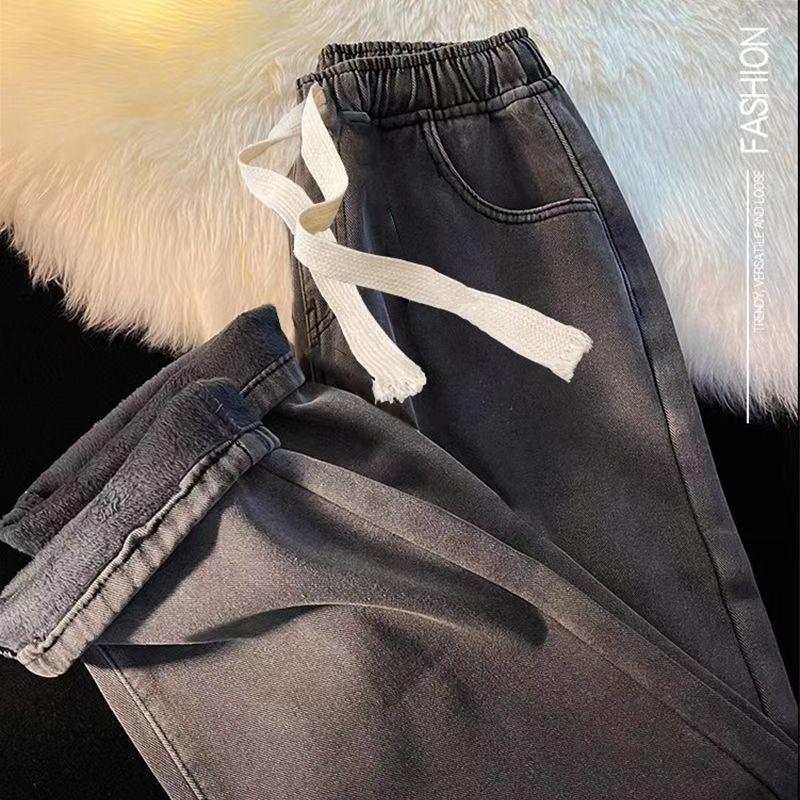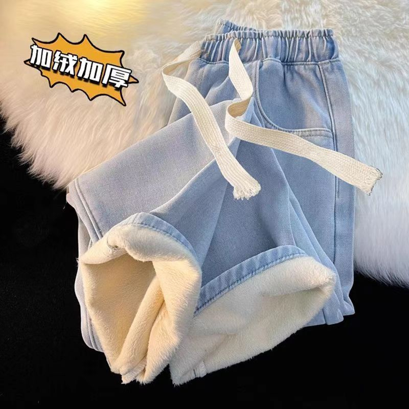 加绒加厚直筒牛仔裤女冬季2025新款小个子阔腿加棉松紧腰秋冬裤子